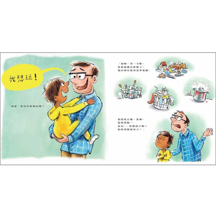 | 這是一本…… ★適合爸爸也適合媽媽,更適合孩子的好書: 書名雖然是「爸爸」,但實際上媽媽也很需要這本書!除了可以請大家一起來做家事之外……還可以找到親職教養好方法──把看起來枯燥乏味的家事變好玩!從書中也可看到「父職參與」在家庭中的重要性。透過共讀,激發孩子想要做家事的動力,讓孩子愛上做家事! ★畫面流暢,充滿節奏感的好書: 這本繪本來自比利時,是臺灣少見的荷蘭文繪本。繪者仔細設計每一個畫面安排,整體節奏流暢明快,每個家事任務的銜接猶如電影場景般切換自然、生動有趣,不僅細節豐富,更深具張力。飽含了滿滿趣味與溫度,值得細細閱讀品味。 ★呈現性別平權與家庭樣貌的好書: 書中的爸爸因為媽媽外出工作,所以得一打二在家中扛起育兒責任。這樣的安排不只顛覆傳統華人家庭分工觀念,卻也如實反映出現代小家庭的真實樣貌。帶著孩子建立性別平權觀念,理解「家事是全家的事」,也能夠一起討論家事分工,培養孩子的責任感與生活自理能力。 ★想像力大爆發,趣味滿滿的好書: 孩子「想玩」是天性,但大人通常因為日常瑣事而無法專心陪伴孩子。書中的爸爸想到了一舉兩得的好方法,既能完成家事,又能帶著孩子一起玩!而這個方法充斥滿滿的想像力!跟著爸爸天馬行空的完成一個接一個的「任務」,在遊戲中創意無限的讓孩子學習主動參與家中日常! ★帶領孩子實踐「做中學」的好書: 美國著名教育家杜威曾提出的一個教育理念「做中學」。讓孩子從實際動手中,提升學習興趣,培養主動思考與自主學習能力。義大利心理學家兼教育學家蒙特梭利也提出了「工作」的概念,從重複操作教具或執行家事的過程中,培養孩子動手做的能力,促進專注力的提升以及小肌肉發展能力。從小讓孩子一起做簡單的家事,對於孩子大大助益喔! ★促進親子情感交流的好書: 書中的爸爸不是站在旁邊請孩子做家事,而是成為孩子的冒險夥伴,一起完成每個家事任務。這本書體現了親子交流中,「陪伴」與「傾聽」的重要性。孩子會因為你的陪伴而願意參與更多事──「情感連結」在教育中的重要性遠高於效率與目標的達成,陪伴是最珍貴的教養。每一個美好的時刻,都將是未來的動人回憶。陪伴孩子邊玩邊做家事吧!