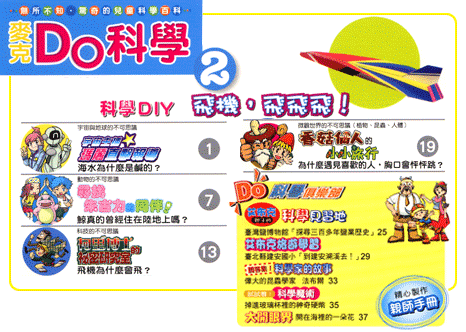 宇宙與地球的不可思議—海水為什麼是鹹的? 動物的不可思議—鯨真的曾經住在陸地上嗎? 科技的不可思議—真的可以製造出時光機嗎? 微觀世界的不可思議—為什麼遇見喜歡的人,胸口會怦怦跳? DO科學俱樂部—科學見習地:臺灣鹽博物館 艾布克旅遊學習:台北縣建安國小 科學家的故事:法爾布 科學魔術:掉進玻璃杯裡的神奇硬幣 親師手冊 科學DIY—飛機,飛飛飛!