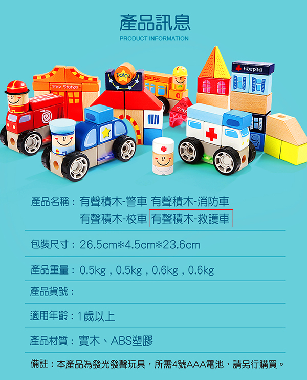 生活中孩子最常見的消防車來囉!仿真車輪、炫彩發光加上模擬真實車輛發聲可以讓孩子學習認知交通工具。動手搭建積木的過程中訓練手眼協調和小肌肉發展,透過主題積木發揮想像力,建構出不同的創造力。優質實木選自歐洲生態環保綠色森林區的高品質木材,塗料採用歐盟標準環保水性漆,漆膜細滑,無毒無味,安全標準高於歐盟檢測認證。