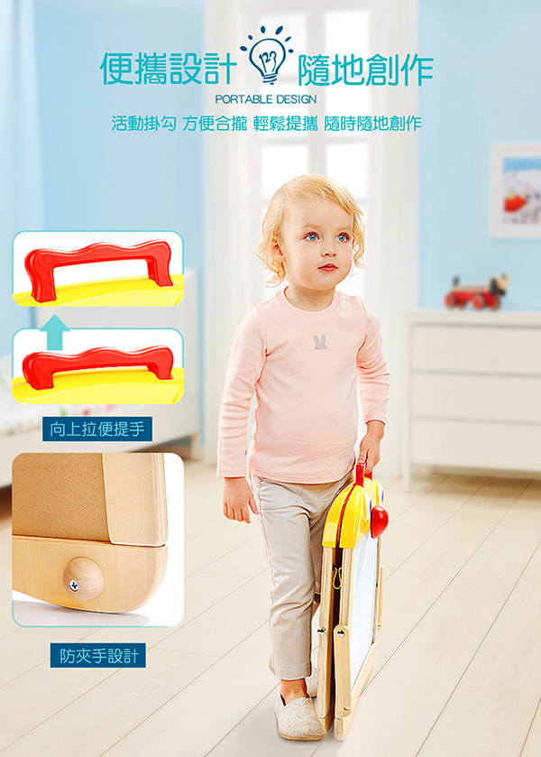 咕!咕!咕!.....可愛的二合一小雞造型畫板,一面是白板、一面是黑板的多功能設計,讓孩子有更多盡情發揮想像力和創造力的選擇,白板部分可以用水性彩色筆進行繪畫,黑板部分可以粉筆類的來塗鴉,白板具有磁性可以還可以將畫紙固定在畫板上畫畫。小雞嘴巴造型的板擦,除了容易抓握也方便攜帶,畫板採用歐洲天然木材,嚴格控管品質並且符合歐盟安全規範,圓弧的邊框和不夾手的設計讓小朋友安心自由發揮創作自己的作品。