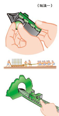 玩法一:怎樣操作才能讓小火車頭順利的穿過山洞? 玩法二:將鐵軌往上提,成一斜坡,不同的高度,小火車下滑的速度一樣嗎? 玩法三:改變玻璃珠的大小,觀察小火車移動的情形。