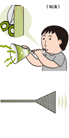 玩法一:如圖所示,將吸管前端剪成一個三角形的吹口,試著吹出聲音。 玩法二:改變吸管的長度再吹吹看,是否能製造出各種不同的聲音? 玩法三:拿掉紙製的竹筍造型部分,比較有竹筍和沒有竹筍時,發聲的異同。