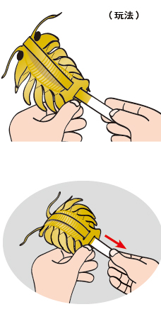 玩法一:仔細觀察三葉蟲的紙藝作品,發現三葉蟲的尾巴拉條有兩張紙條。 玩法二:用手輕輕的拉動三葉蟲尾巴上方的紙條,觀察三葉蟲身體的動作。 玩法三:用手輕輕的拉動三葉蟲尾巴下方的紙條,觀察三葉蟲身體的動作。