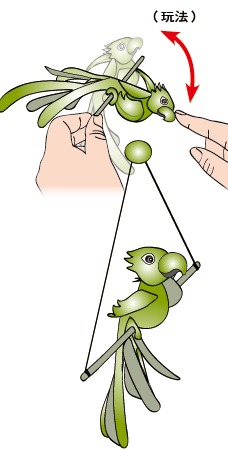 玩法一:將吸管插入鸚鵡紙藝作品的爪子中間,使鸚鵡能穩定的站立在吸管上方,然後輕輕用手撥動鸚鵡的頭部,就可以使鸚鵡的身體前後擺動。