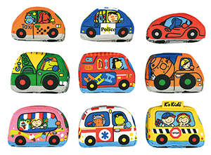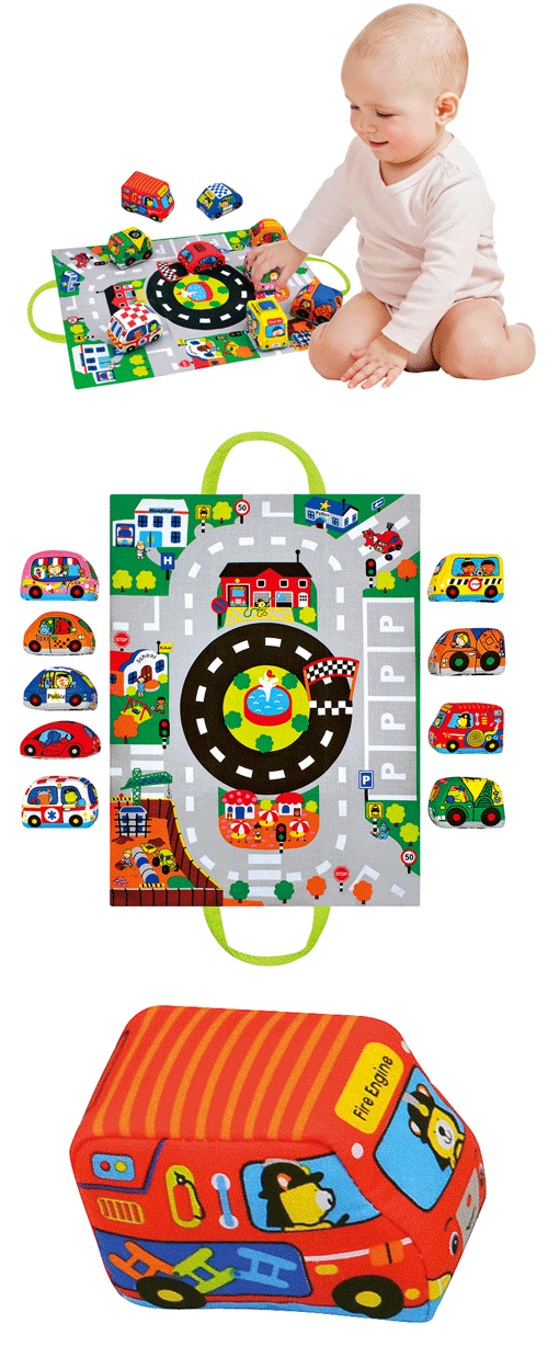 由9款不同顏色的布車子和一張城市地圖遊戲墊組成,地圖上有學校、消防局等設施,車子更有不同職業和號碼分類,非常適合孩子作角色扮演和學習相關主題。車車還可發出??吱吱聲、響紙聲和響鈴聲,好玩又有趣!