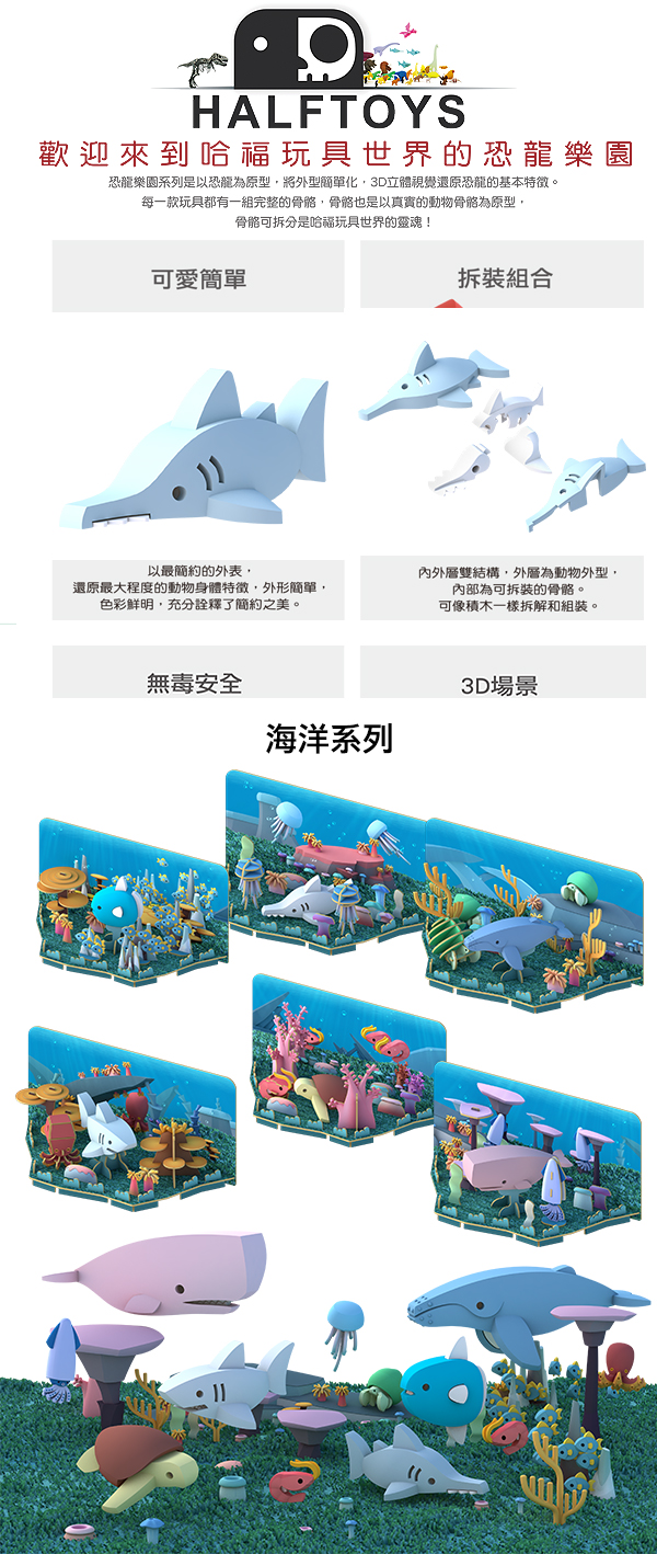 海洋樂園系列是以海洋動物為原型,將外型簡單化, 3D立體視覺還原動物的基本特徵。 每一款玩具都有一組完整的骨骼,骨骼也是以真實的動物骨骼為原型, 骨骼可拆分是哈福玩具世界的靈魂!